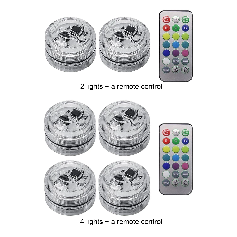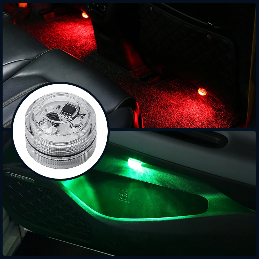 Car Roof Foot Atmosphere Light Battery Operated Auto Atmosphere Lamp IP68 Waterproof Multicolor LED Light RGB Remote Control Kit Feature: Specification: Origin: Mainland China Item Type: Atmosphere Lamp Material: PC+LED Colour: Transparent Light colour: RGB LED chip: SMD3528 Remote operation distance 10m Specification options: 2 lights + a remote control, 4 lights + a remote control. Power supply:CR2032 (Battery included in both light and remote control) Waterproof rating:IP68 Installation method: Markerless glue paste Product Size:30.00x30.00x22.00mm/1.18x1.18x0.87inch Suitable for: car interior decoration ambient light, wedding, festival, fish tank, pool, fountain, stage, disco, toys, vase, shopping malls, jewellery shops, showrooms, display cabinets, cupboards, museums, shops, home bulbs and other occasions Note: