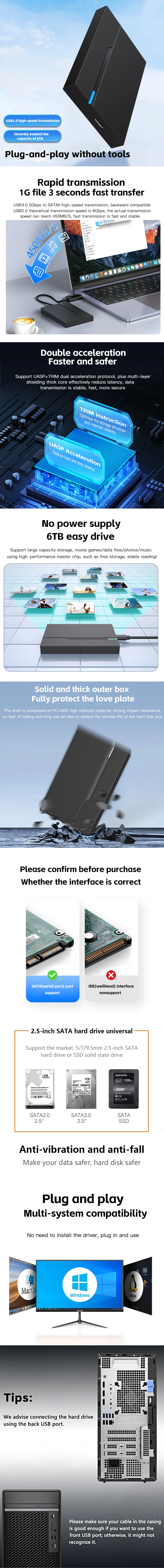 4) Universal Compatibility: Supports Windows, LINUX, Mac OS 8.0 and above systems. Designed for 2.5 inch 7mm/9.5mm SATA HDD & SSD up to 6TB. Compatible with WD, Seagate, Toshiba, Hitachi, Samsung, Crucial, SSD and HDD with SATA port and so on.