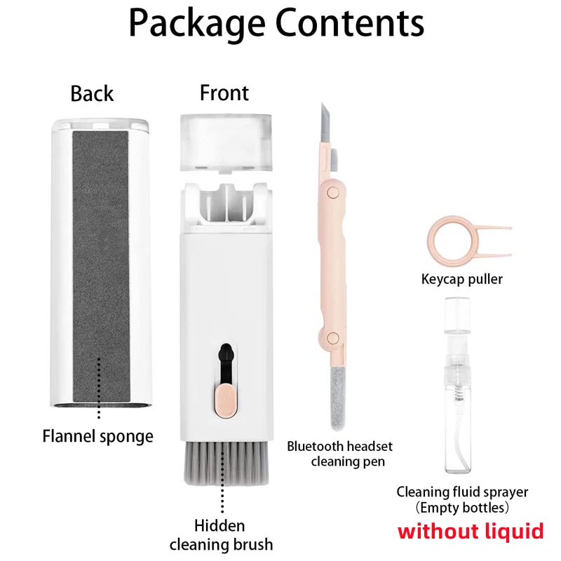 3. In accordance with air transport safety regulations, the spray bottle in the 7-in-1 cleaning kit cannot contain detergent or alcohol, the buyer can add detergent or alcohol to the spray bottle after receiving the product.