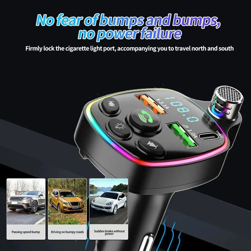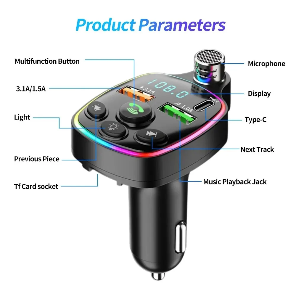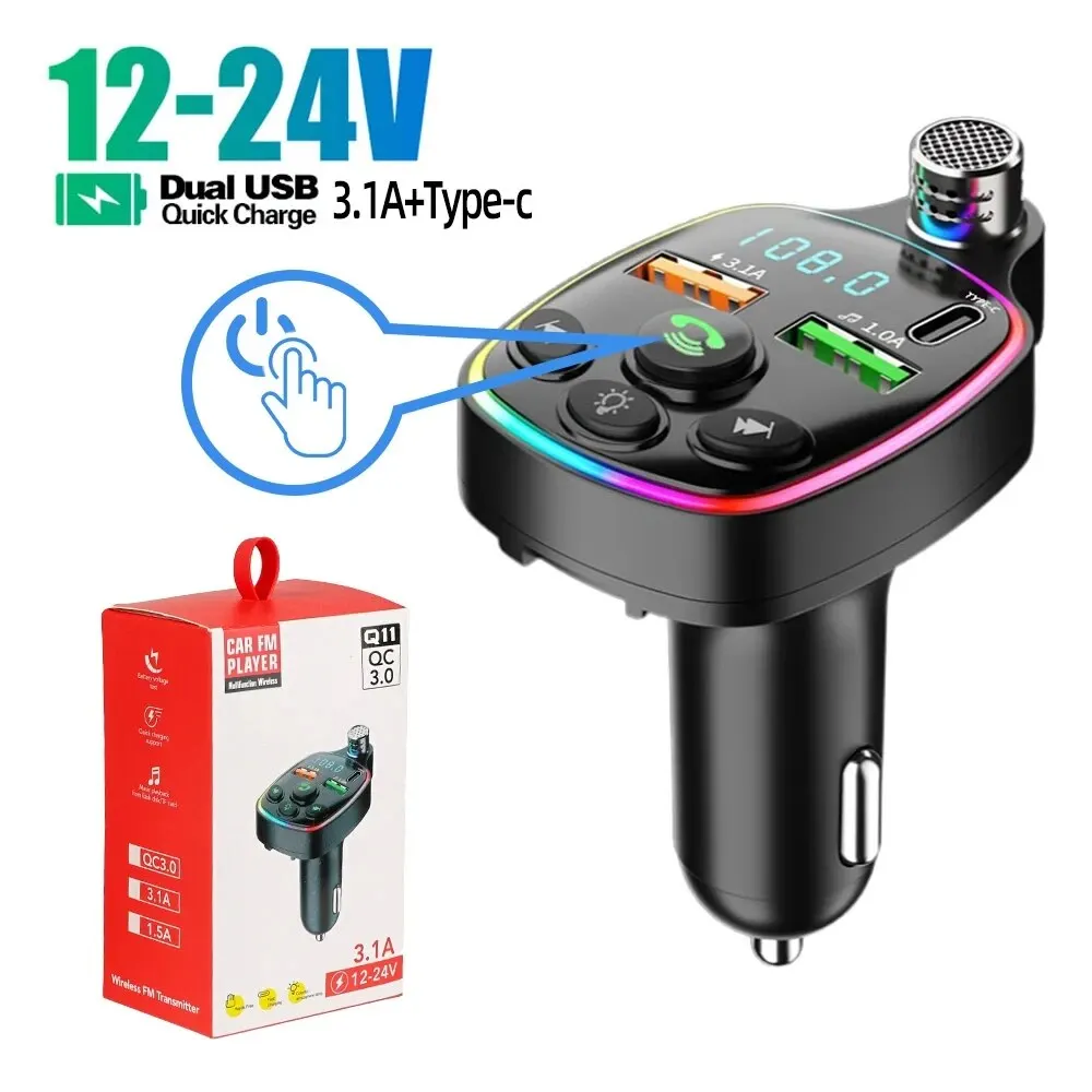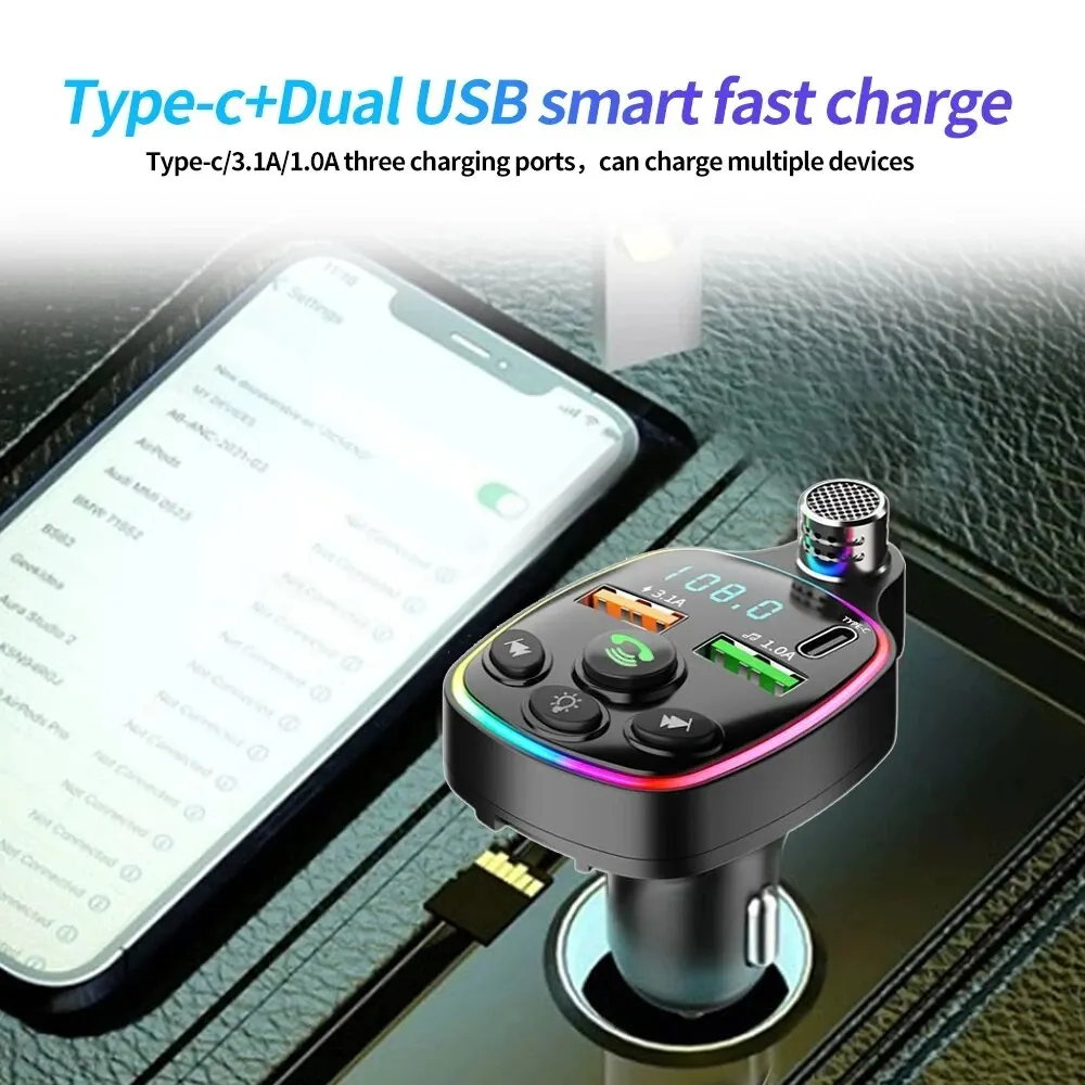 Car Bluetooth 5.0 Charger Q11 FM Transmitter Dual USB 3.1A PD 20W Colorful Ambient Light Cigarette Lighter MP3 Music Player
