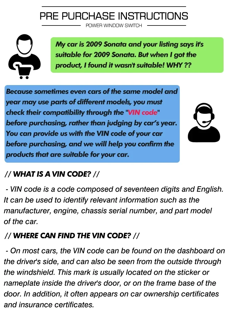 1. To prevent you from purchasing products that are not suitable for your vehicle, please check if the part number (OE code) of the product is the same as the part number (OE code) of your vehicle before placing an order, or you can also tell us the VIN code of your vehicle, and we will help you check the parts that are suitable for your vehicle.