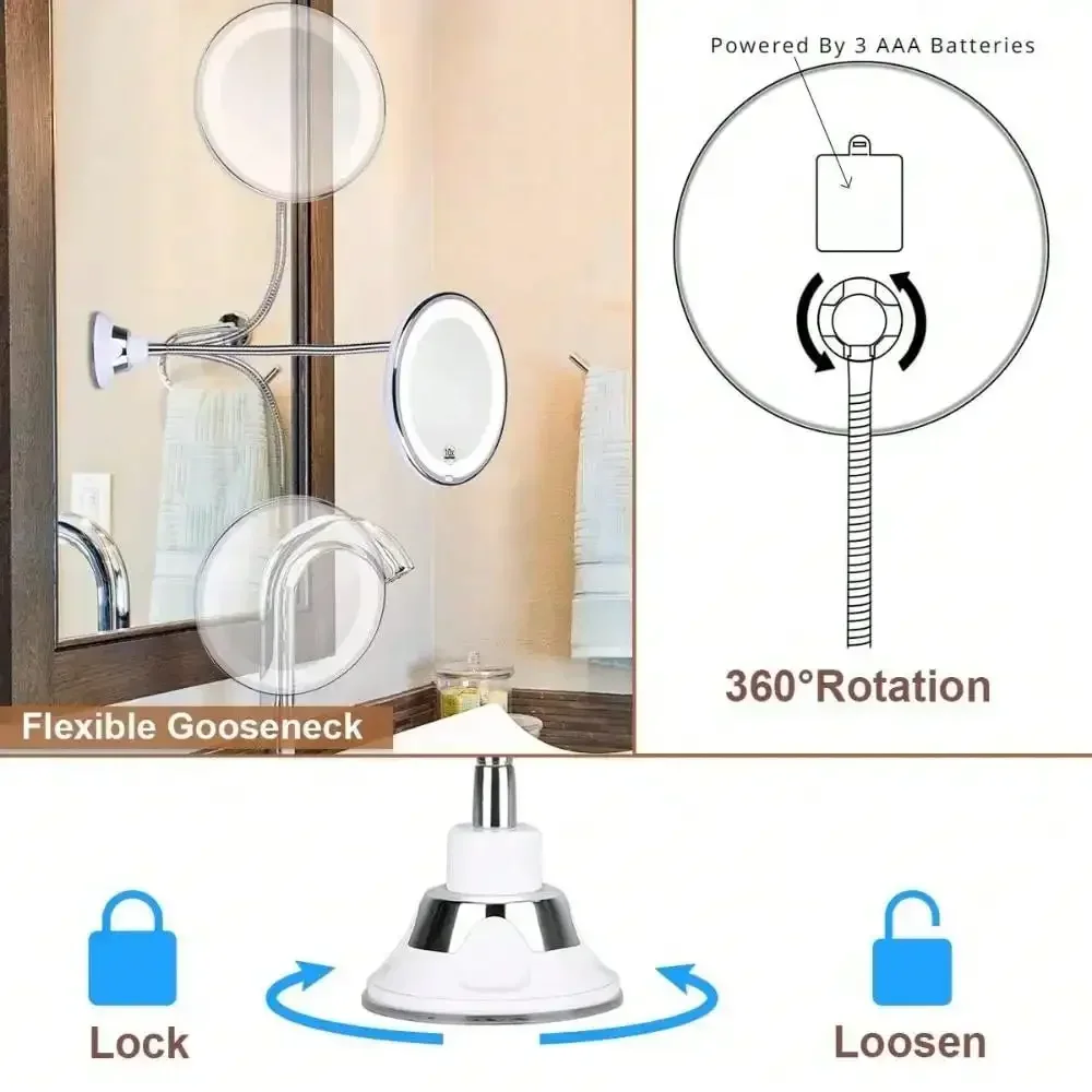 Flexible Gooseneck Makeup Mirror with LED Light 10X Magnifying Mirror Suction Cup Bright Diffused Light and 360 Degree Swivel