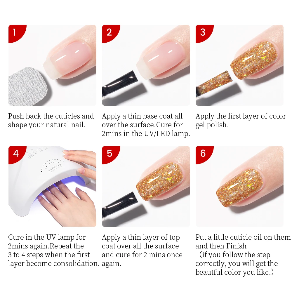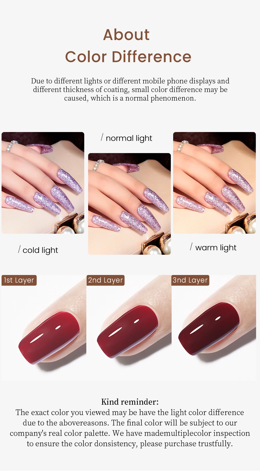 Warm Reminder:Our gel nail polish will show slight color difference under different display and light sources, but this is normal. if you have any other questions, please contact the store !