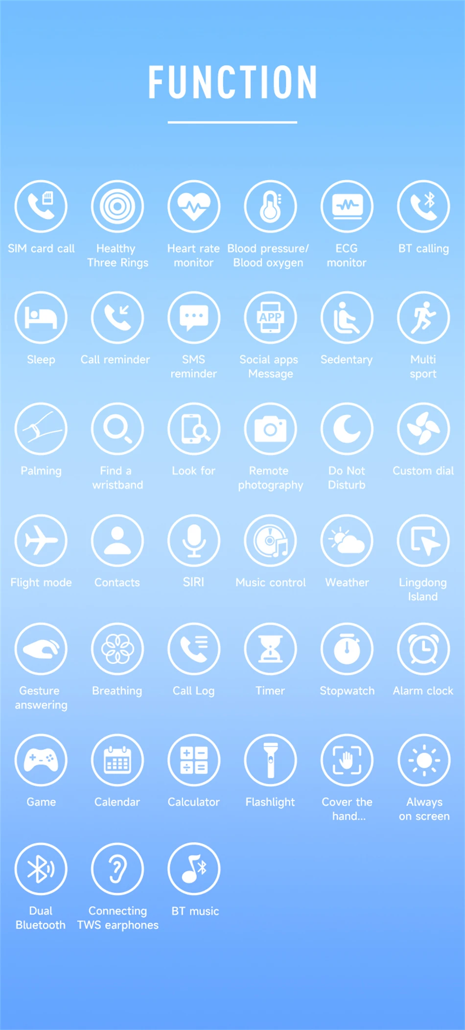 SIM card call, Healthy,Heart rate,Blood pressure/ Blood oxygen ,ECG monitor,BT calling,3D menu, OTA, shortcut bar (control centre), data (pedometer, distance, calorie), heart rate, blood pressure, blood oxygen, sleep, lift wrist to light up the screen, weather, WeChat movement, information, reminder (message, drink water, sedentary, alarm), women's health, stopwatch, countdown timer, find mobile phone, find bracelet, shake to take a picture, dial switching, music control, settings (language selection, Brightness Adjustment, Brightness Duration, Vibration Settings, Restore Factory, Version Information), Switch Logo, Component (Function Edit), Passcode Lock, Breathing Exercise, Exercise, Exercise History, Do Not Disturb Mode, Power Saving Mode, Low Battery Reminder, Voice Assistant (SIRI), Calling Functions, Frequently Used Contacts, Phone Dialpad, Split Screen (Sidebar), Flashlight, Payment Codes, Scanning Code Connections, Business Cards ( Make Friends), Calculator, Engineering Test Mode & Shipping Mode, Calendar, Alipay Payment, Wenxin Yiyi, AI Dial, Experience Game, Map Navigation, Short Video Control, Compass.