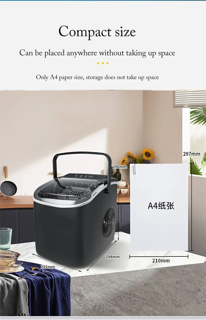 4. Self-Cleaning & Compact size: Press for 5 s Turn on/off to start self-cleaning function and wait for 30 mins finish. For the sake of your health, the portable ice maker had better be cleaned once a week.