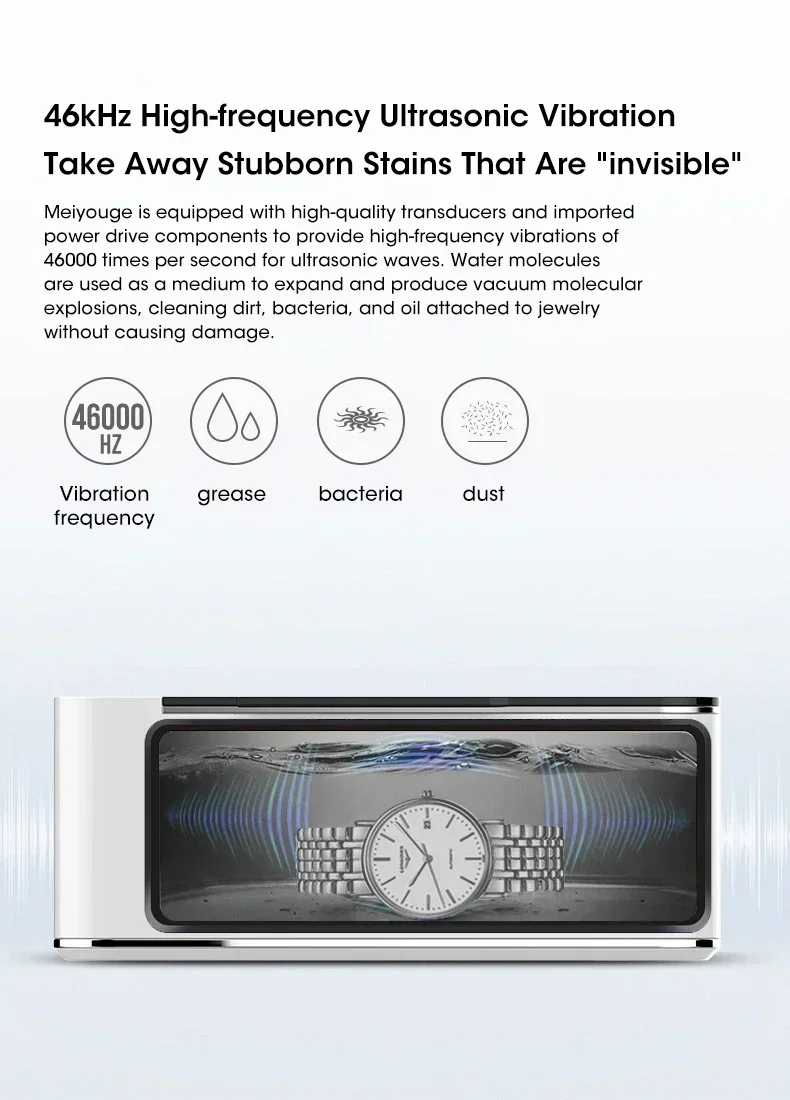 1.Advanced ultrasonic technology: Our ultrasonic cleaner operates at a frequency of 46,000 Hz, 50W. Harnessing the power of cavitation, it effectively removes surface dirt from items without damaging them.