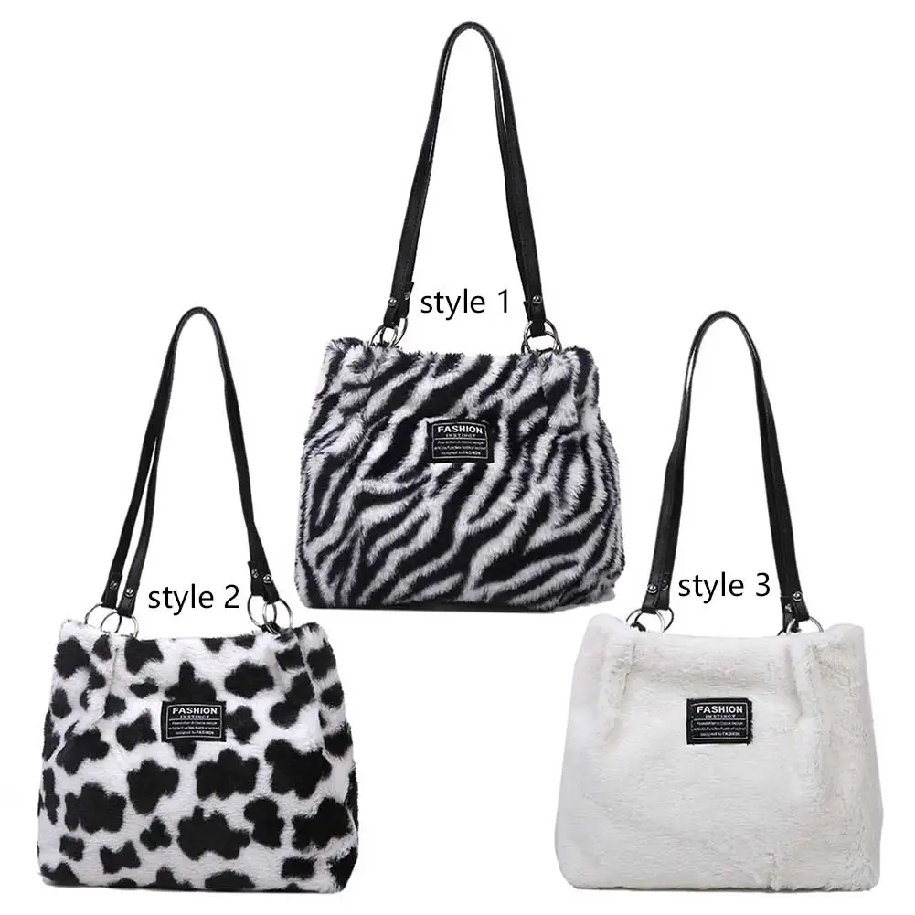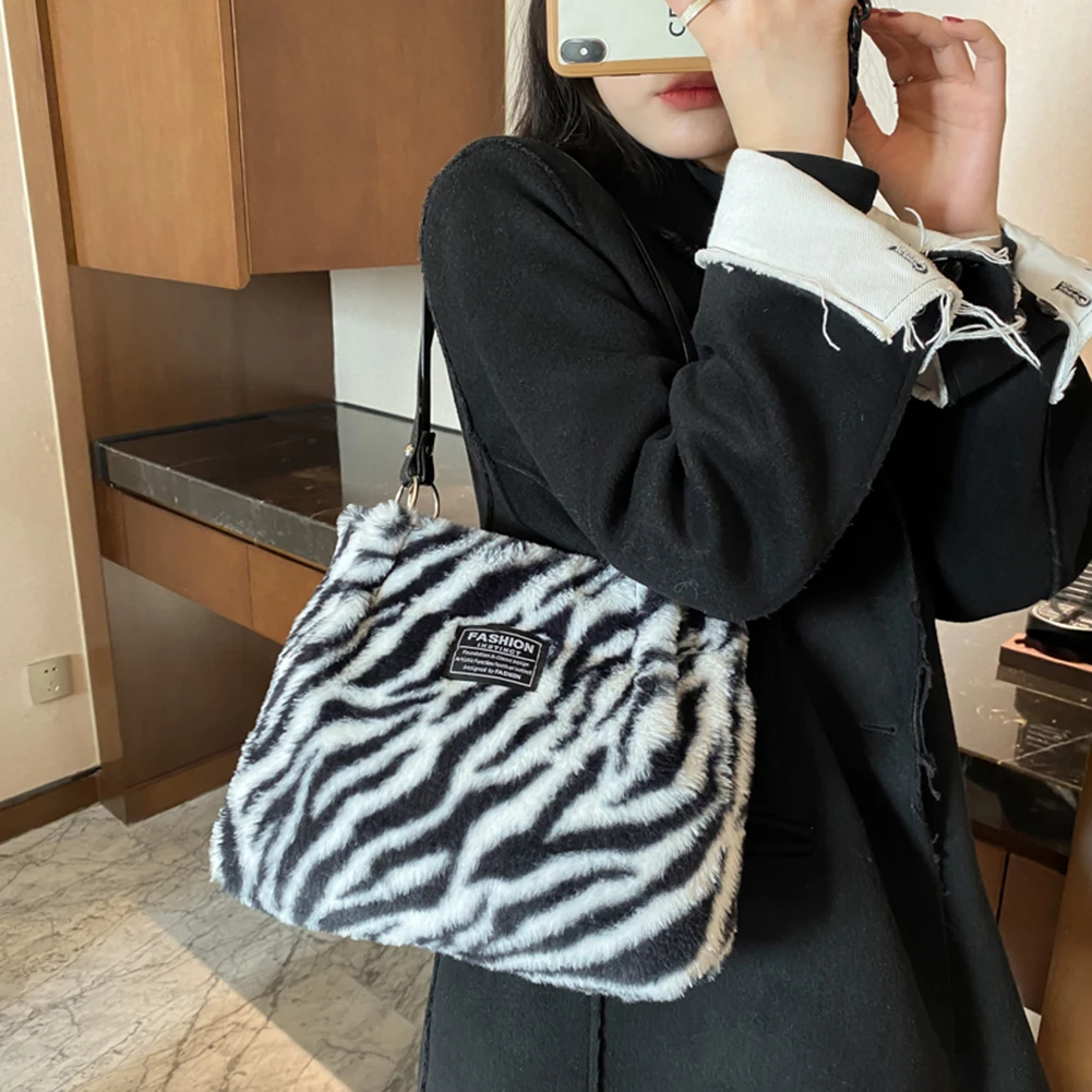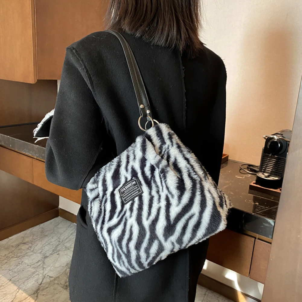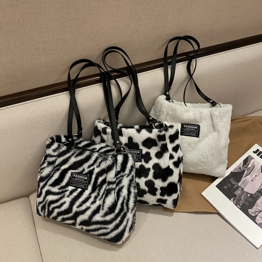 Women Plush Tote Bag Versatile Furry Shoulder Bag Zebra/Cow Pattern Fluffy Satchel Bag Cute Tote Handbag Fuzzy Faux Fur Handbag