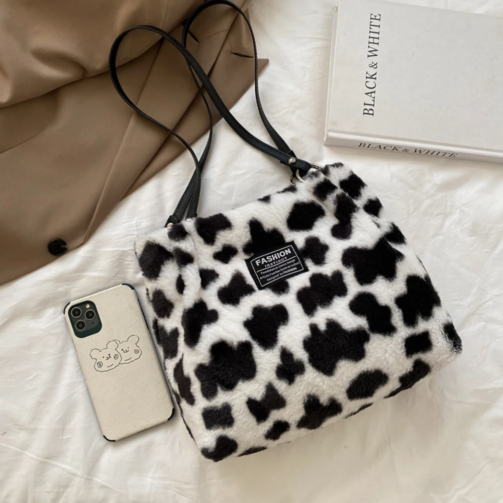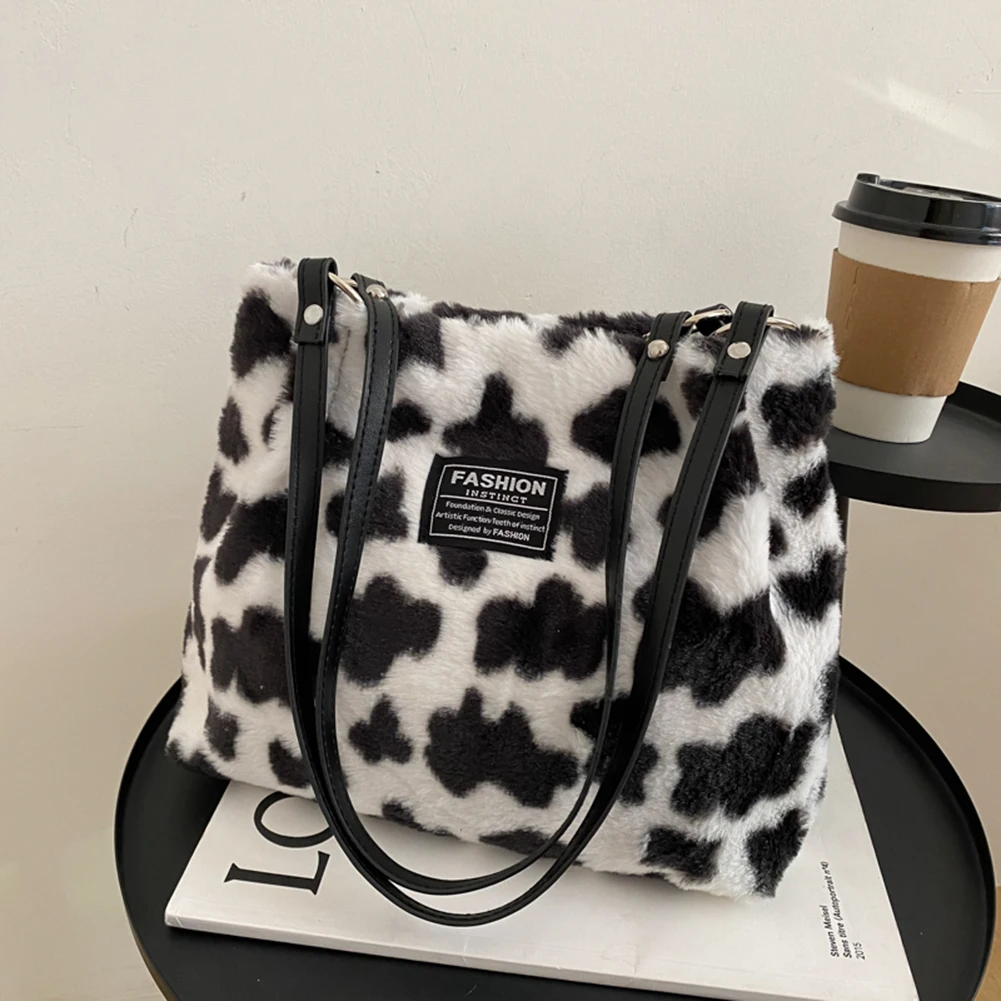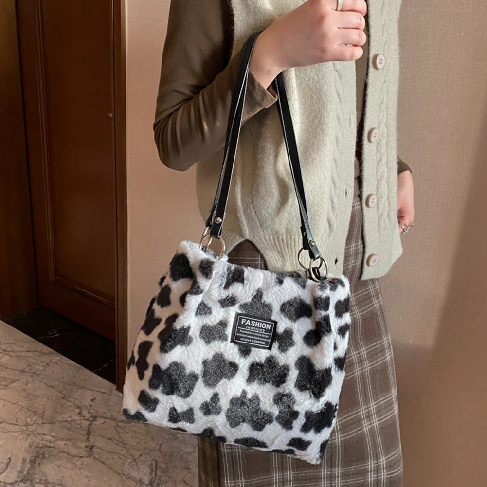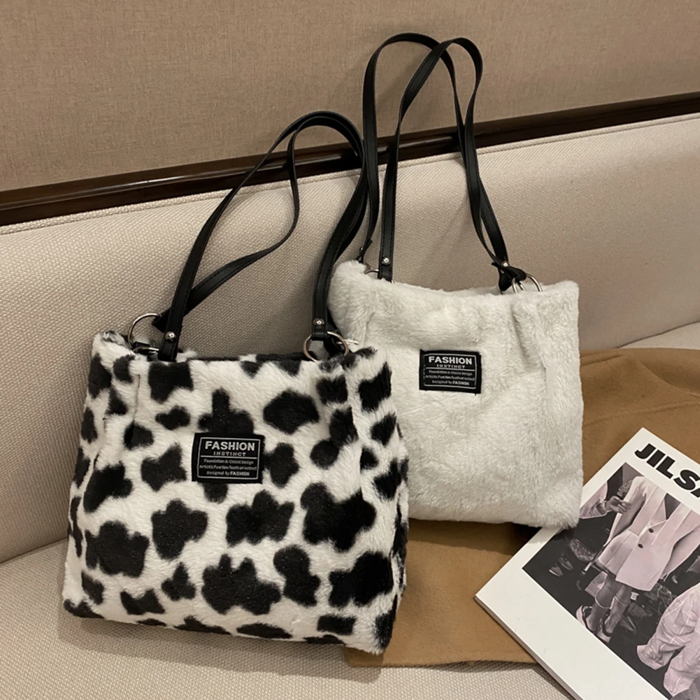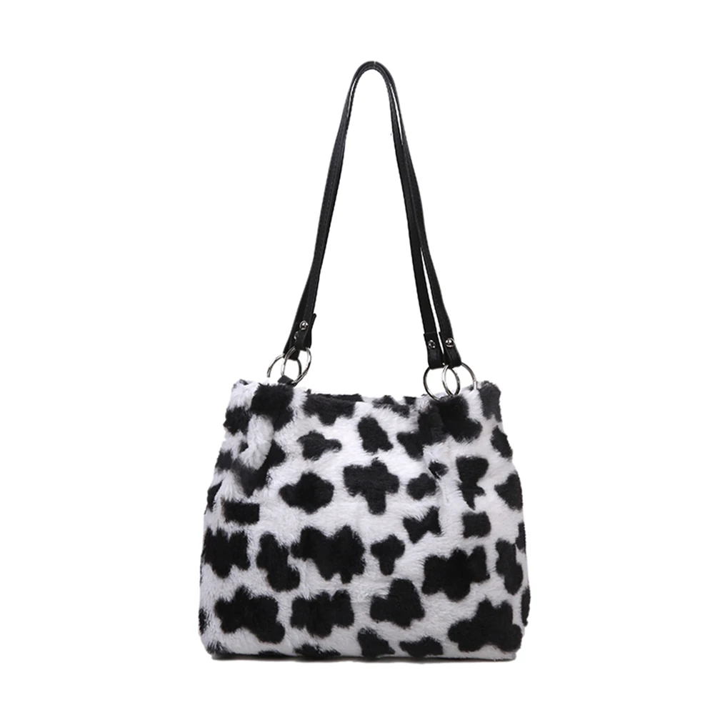 Women Plush Tote Bag Versatile Furry Shoulder Bag Zebra/Cow Pattern Fluffy Satchel Bag Cute Tote Handbag Fuzzy Faux Fur Handbag